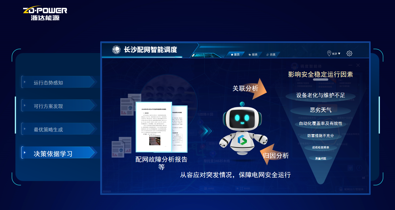 在新型電力系統背景下,湖南長沙配網調度面臨諸多挑戰,包括配網規模快速增長、拓撲復雜多變、安全可靠性要求提高,以及分布式電源和充電樁的大量接入導致源荷不確定性增強。為應對上述挑戰,長沙公司結合國網公司人工智能規模化應用的要求,全力攻堅人工智能大模型在配網調度負荷轉供場景的應用,為調度員提供最優轉供策略,構建智慧配電網運行管理和調度新模式。浙達能源策劃、設計、開發該系統產品,并聯合浙江大學、南瑞等行業內知名產學研單位,共同打造了AI與機理模型深度融合的配電網智能調度員,同時提升配網運行效率與可靠性。